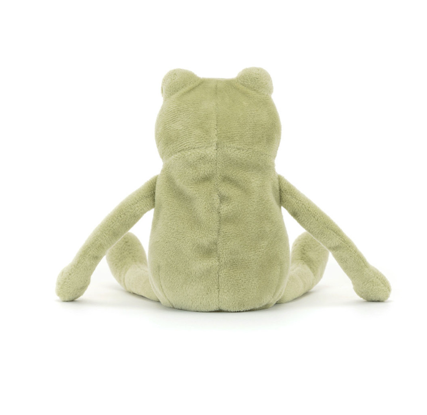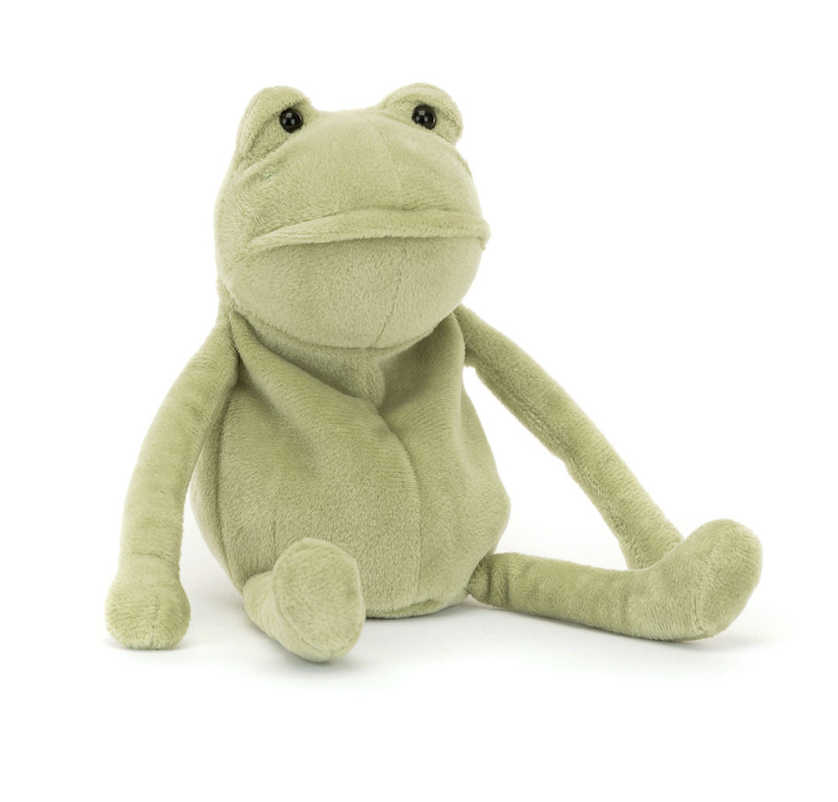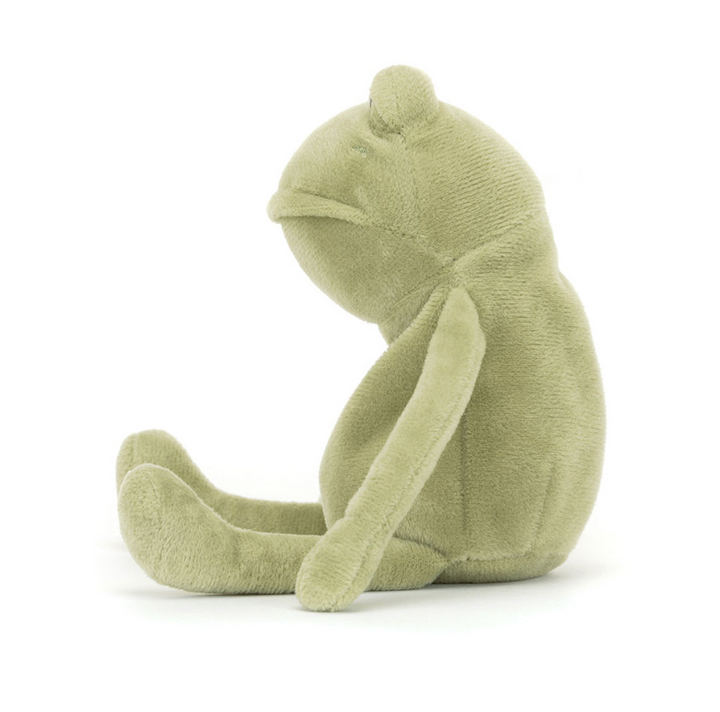 Fergus Frog is a mossy sweetheart in soft velour. With a beany base and toes, hooded eyes, a piped mouth, and lovely glossy eyes, Fergus is a little rumpled and somewhat grumpy, but full of froggy wisdom.