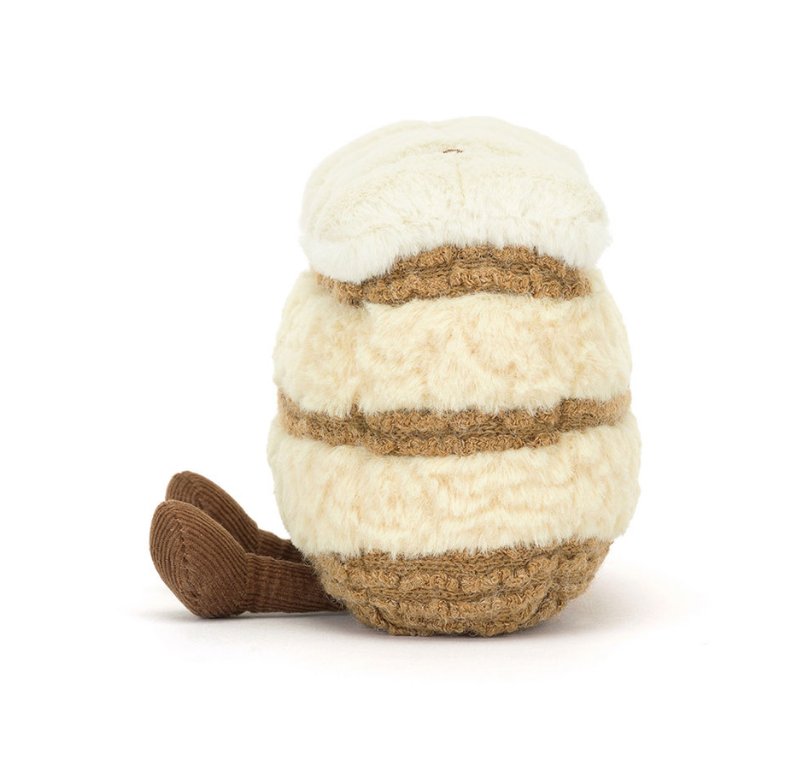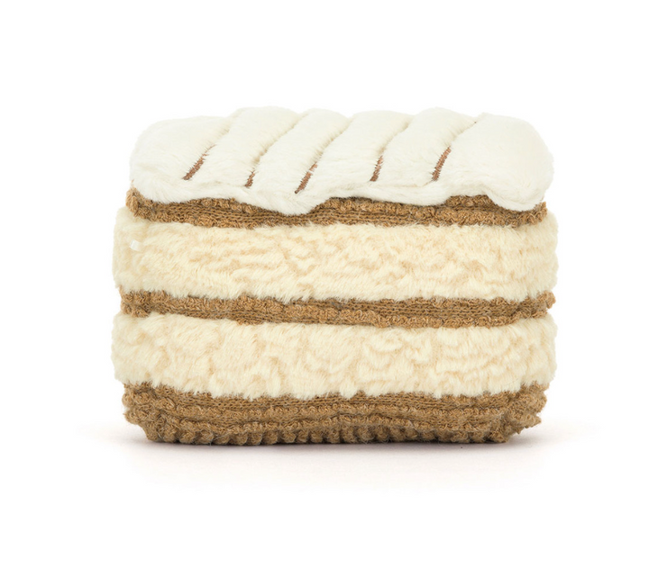 Amuseables Milie Mille Feuille is layered for perfect cuddles. Fluffy crème pâtissière is layered between textured beige pastry, and topped with a thick layer of cream icing with stitched chocolate stripes. With a sweet stitched smile and fine cord boots, Milie is the perfect Vanilla Slice for the sweetest gift.