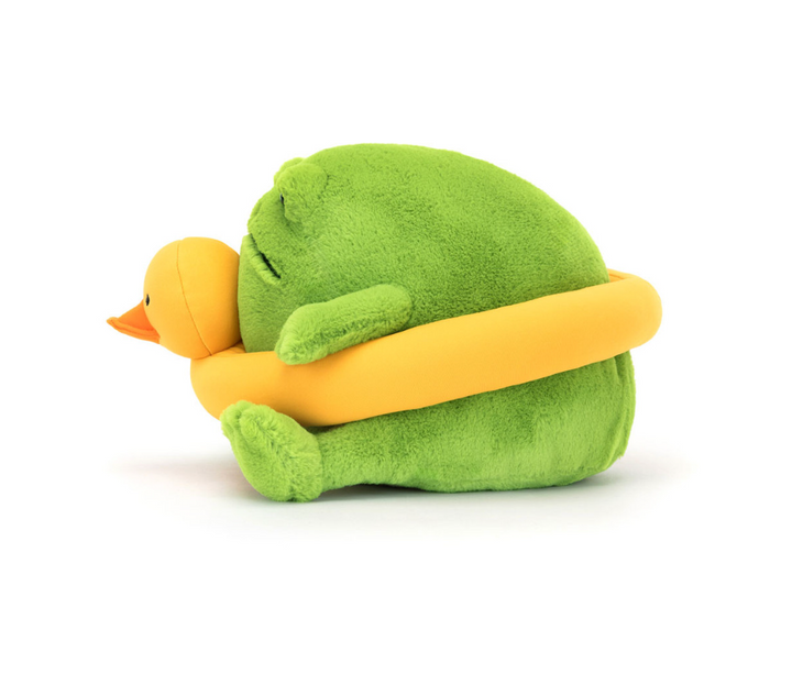 Ricky Rain Frog is ready to relax. Our favorite grumpy frog has found a duck rubber ring in bright yellow cotton to compliment his soft, pea-green fur. Ricky may be sporting a big, stitched frown, but this frog’s got summer vibes for everyone!