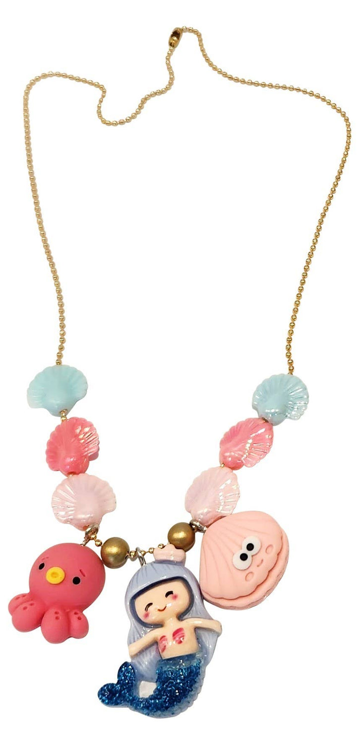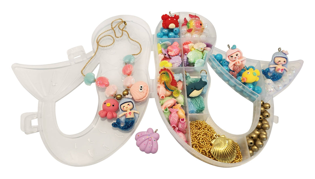 Travel under the sea and make your own magical mermaid jewelry with our mermaid-themed DIY kit! Each kit comes in an adorable mermaid shaped container (6.5" x 6" x .75") with 2 different mermaids, various sea creature pendants (crab, seahorse, octopus, shell, fish, whale) and cool sea themed beads (shells and fish shaped!), a brass shell locket, tassel charms and approximately 60" of gold plated ball chain and clasps which can be easily cut to desired length. Makes 7-9 pieces of jewelry with extra parts to spare.Â