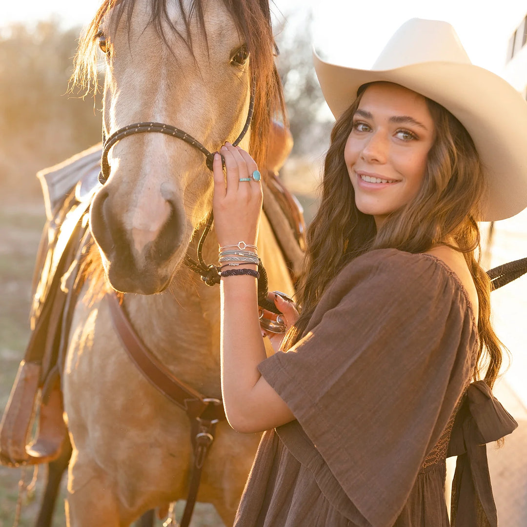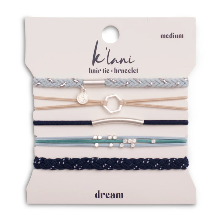 Our DREAM set includes five bracelets that doubles as hair ties in soothing neutral and blue tones with just a hint of shimmery silver. Everything about this set says breathe deep and dream big!