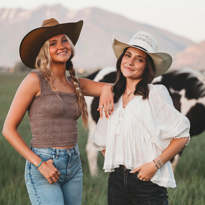 STRIDE Our Stride set includes five bracelets that double as hair ties in the cutest coastal cowgirl colors of blue, brown, cream and teal. This set features dainty boot and horseshoe gold charms that will remind you to lengthen your stride and cowgirl up.