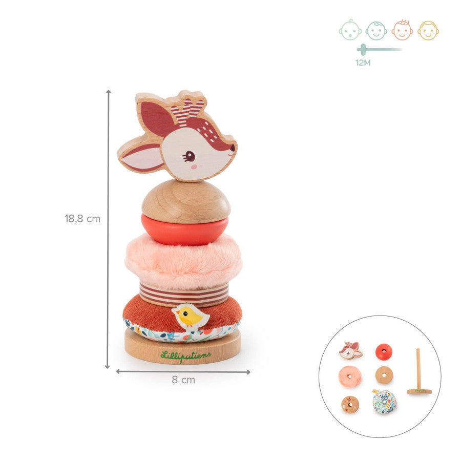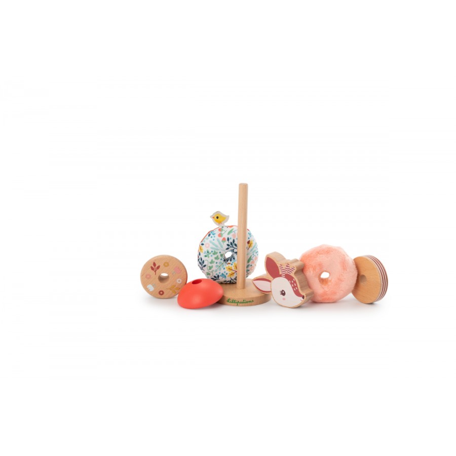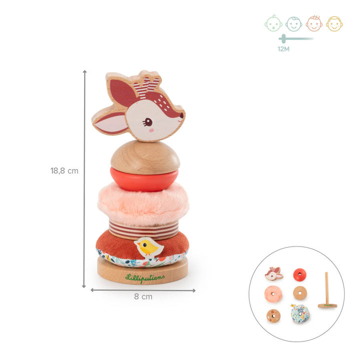 Made of different materials, this original and cheerful stacking pyramid develops the fine motor skills of the little ones. Stack the parts on top of each other and give your creativity free rein. The different materials and colours stimulate the senses.