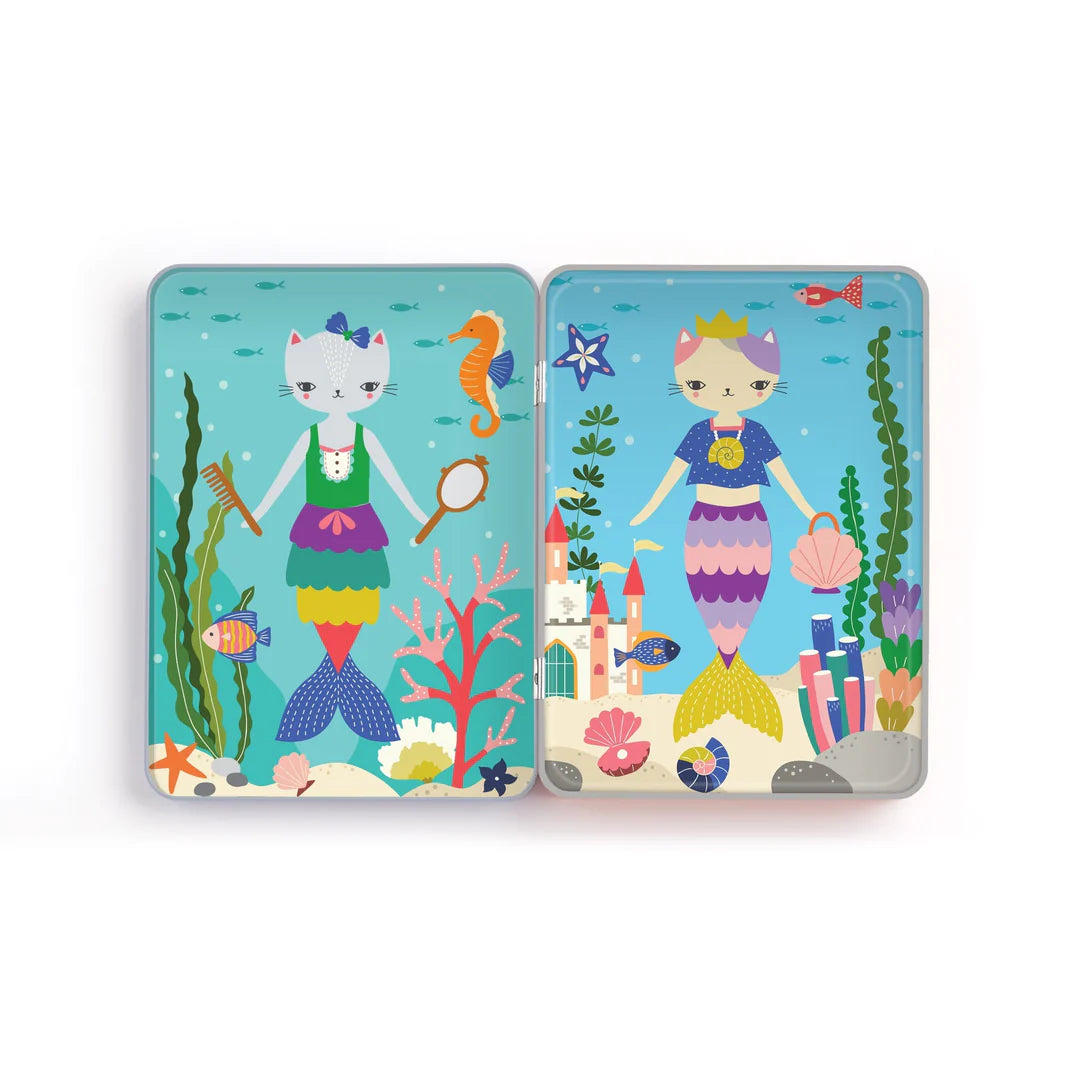 Mudpuppy's Purrmaid Magnetic Dress-up includes 2 illustrated scenes and 3 sheets of mix and match magnets for dressing up these adorable cat-mermaids.