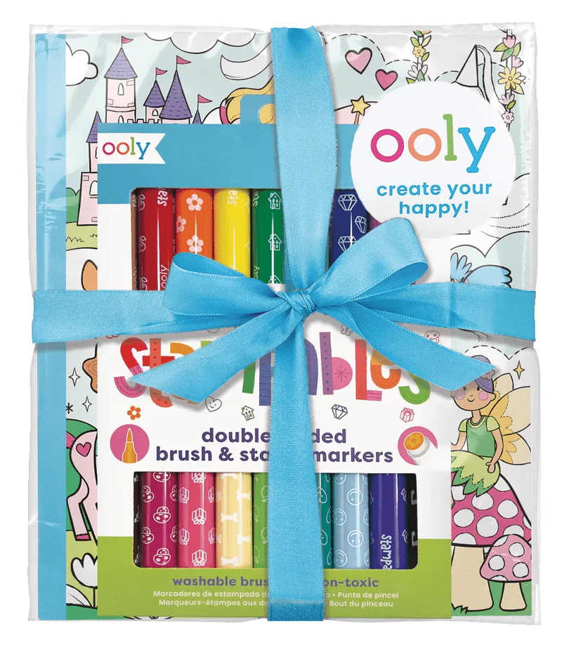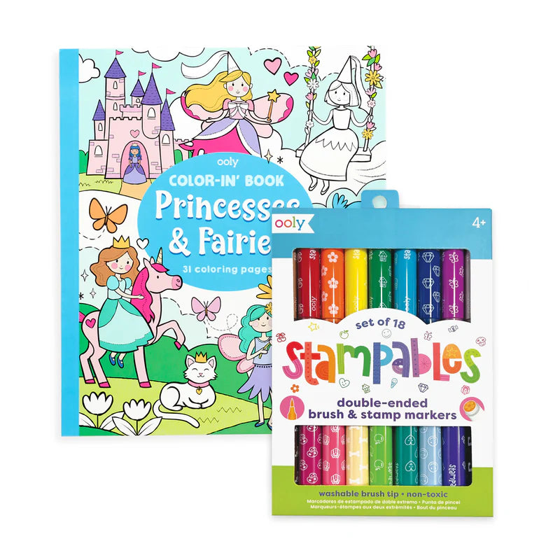 Princess and Fairies Color-in’ Book with the Stampables double ended markers pack comes wrapped with a bow for happy gift giving.