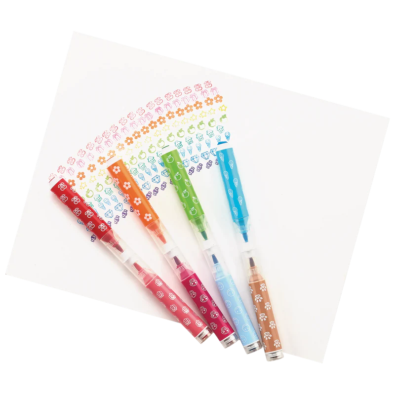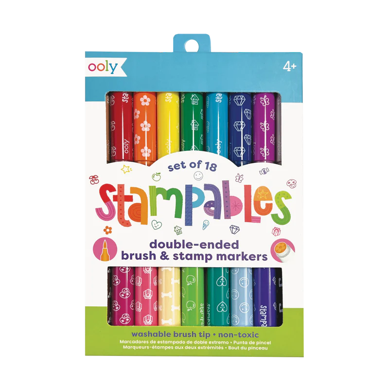 - Set of 18 markers with a brush tip on one end and a stamp on the other