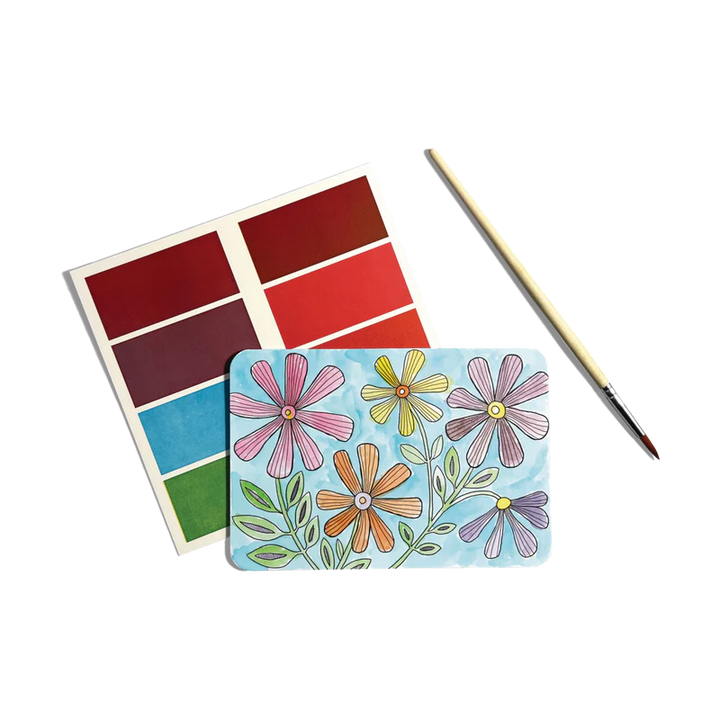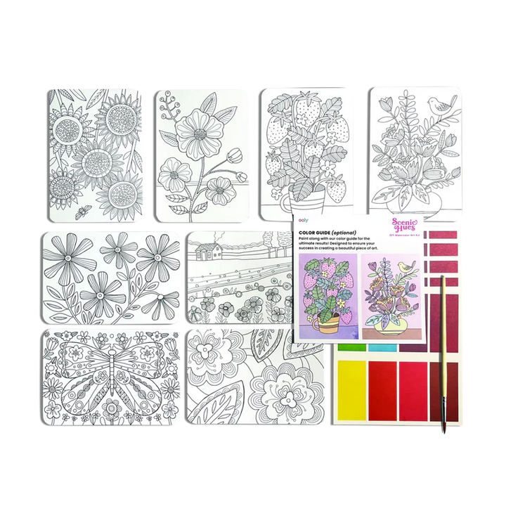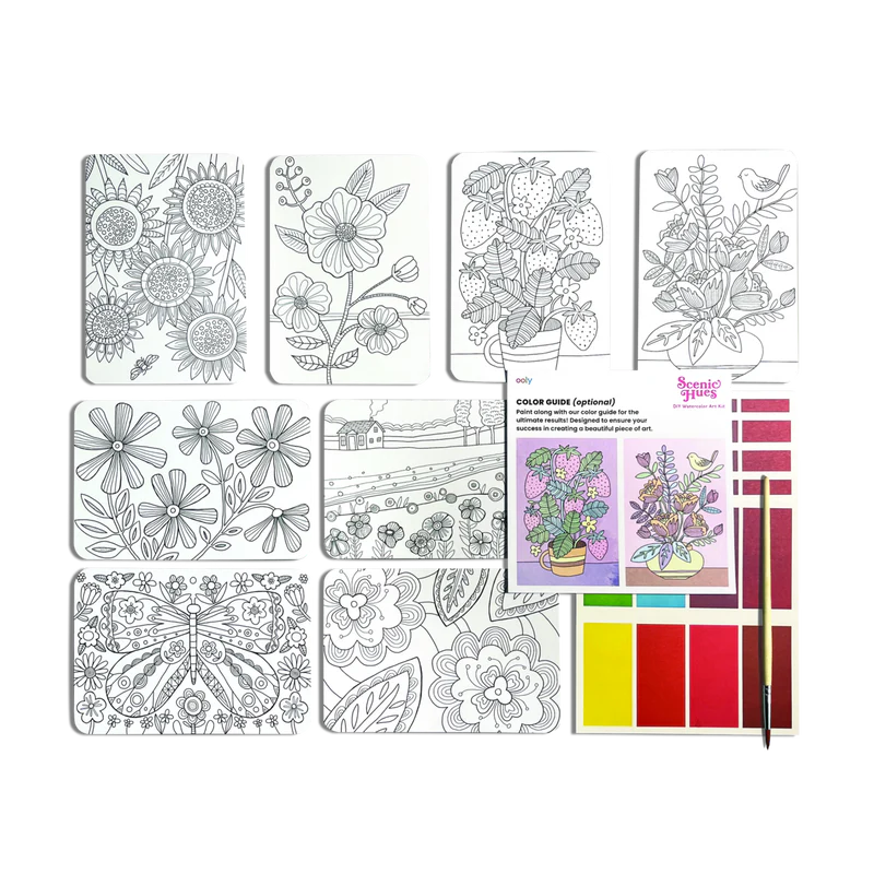This watercolor art kit includes everything you need to create eight stunning watercolors. Taking inspiration from bountiful gardens, this kit includes 8 outlined watercolor postcards, 8 paint palettes, a paintbrush, and an optional color guide. Your masterpiece awaits!