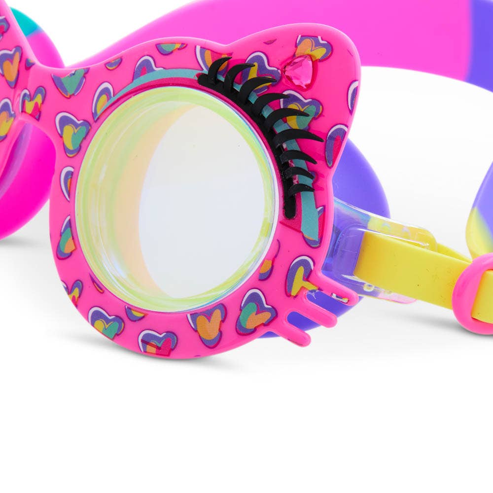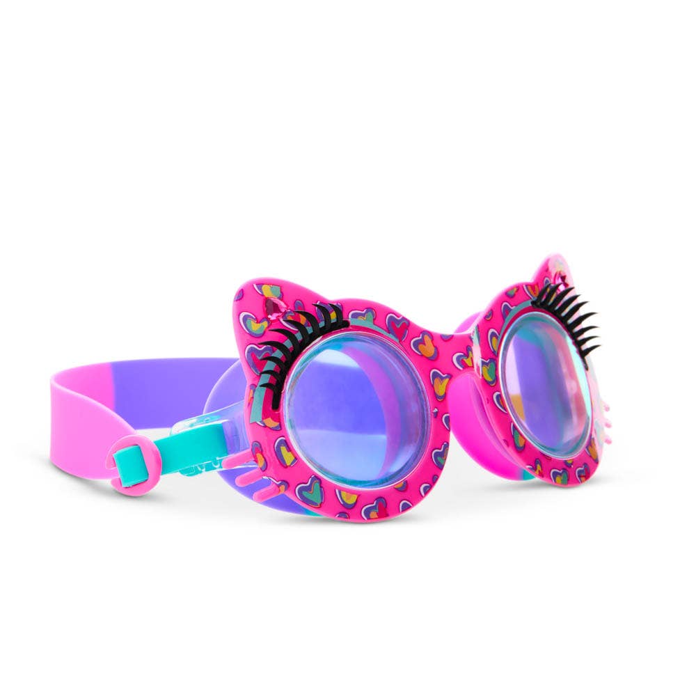 Get your paws wet and make a splash this summer with our Purrty Pink Paws Swim Goggles! Designed for kids ages 6 and up, these adorable cat-framed swim goggles feature a playful Purrty Pink heart print, a full set of wispy lashes, and classic rhinestones for extra sparkle! With a novelty easy-on back clip, they provide a secure, tug-free fit, making pool time purr-fectly fun!