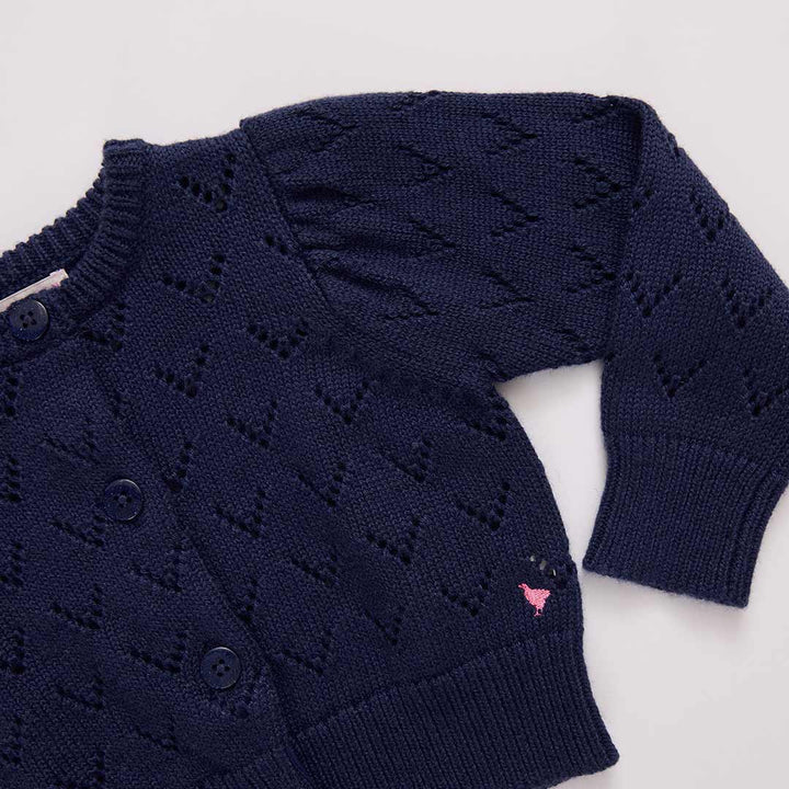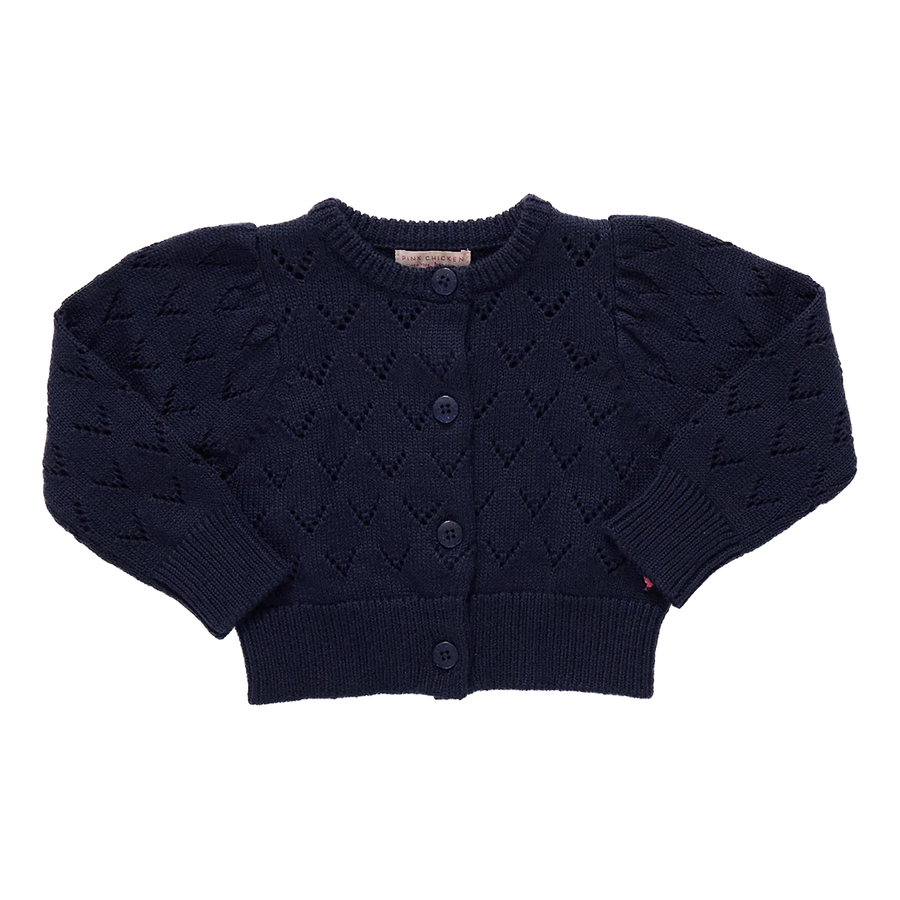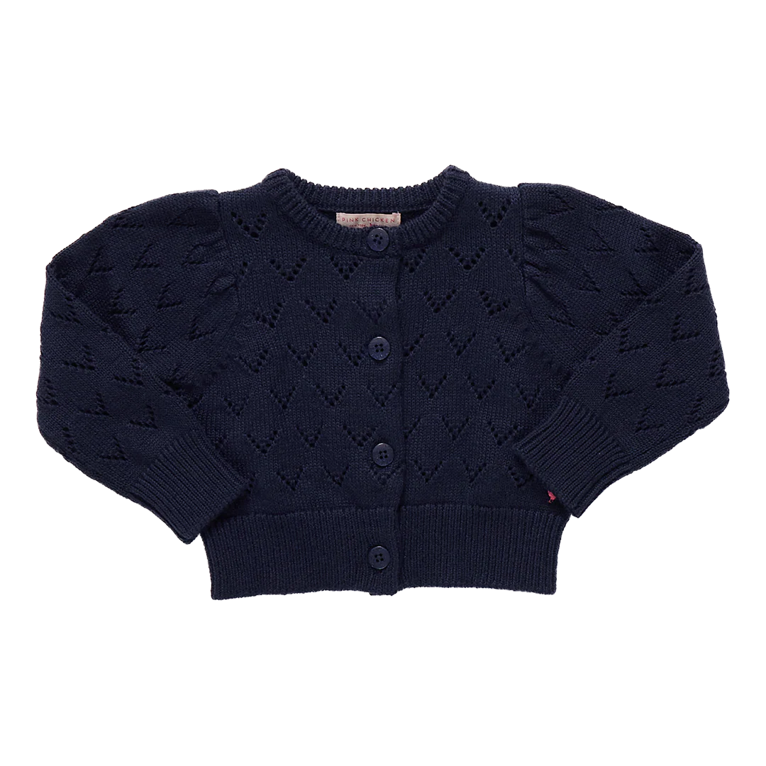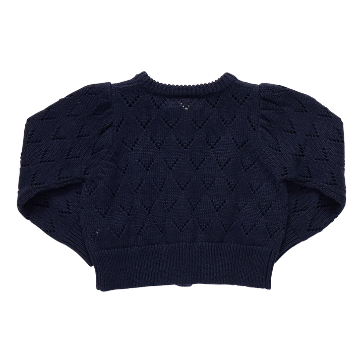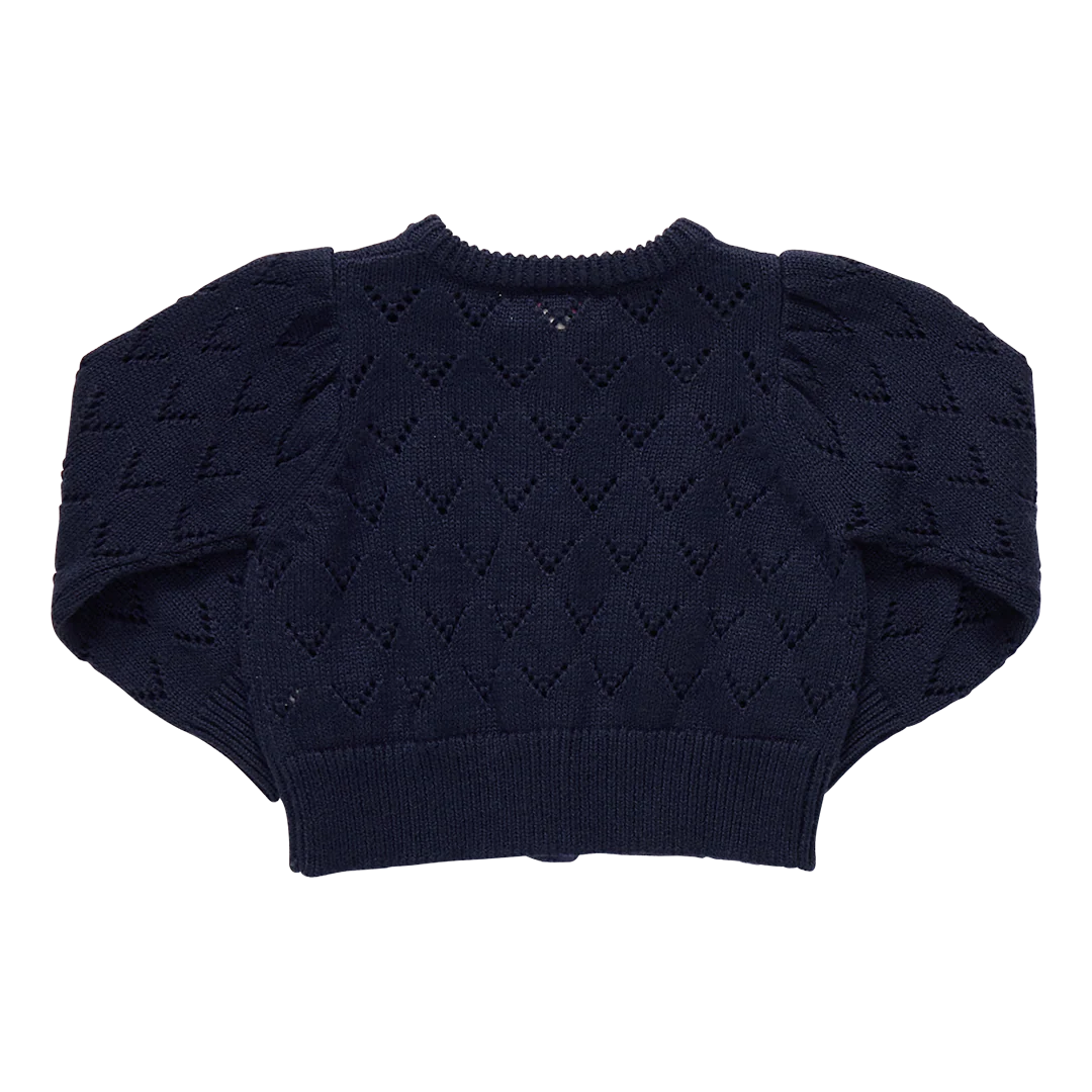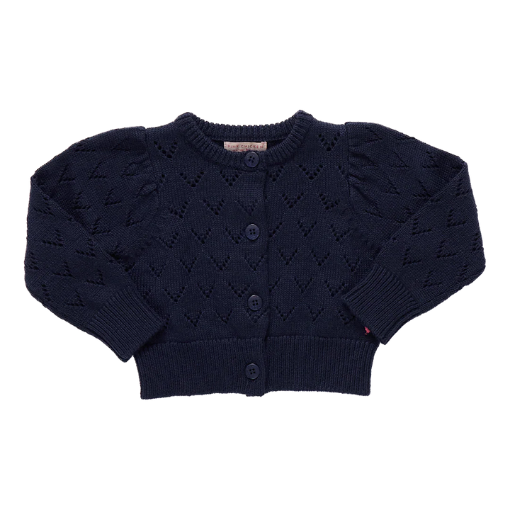 Short And Sweet! Our new to the collection Connie Sweater hits at the hips and pairs perfectly atop any of our Fall dresses, skirts or pants. This soft and cozy pointelle cardigan features a soft gathered puff shoulder and sparkly glitter button front closure.