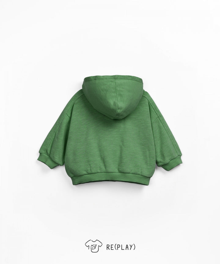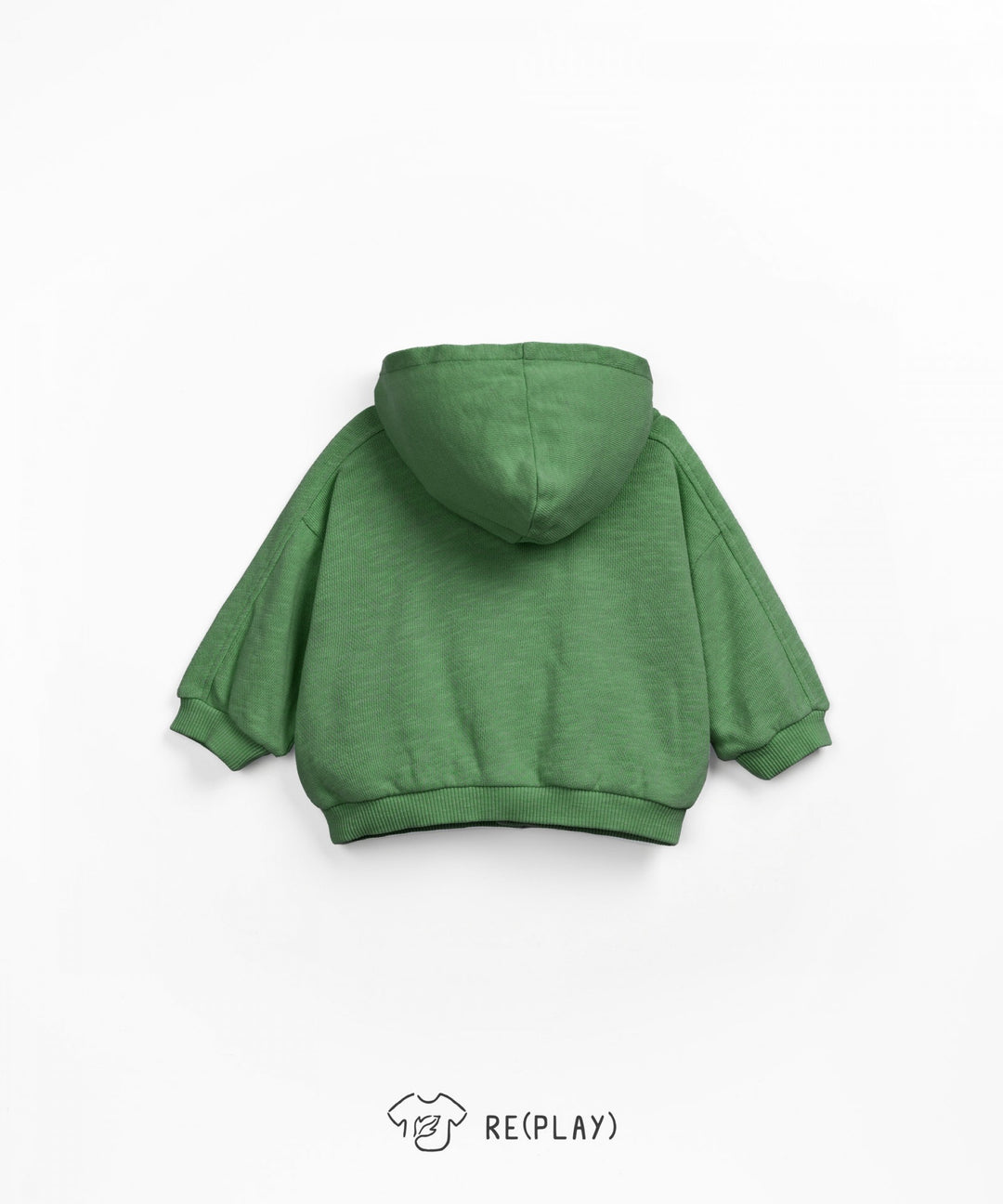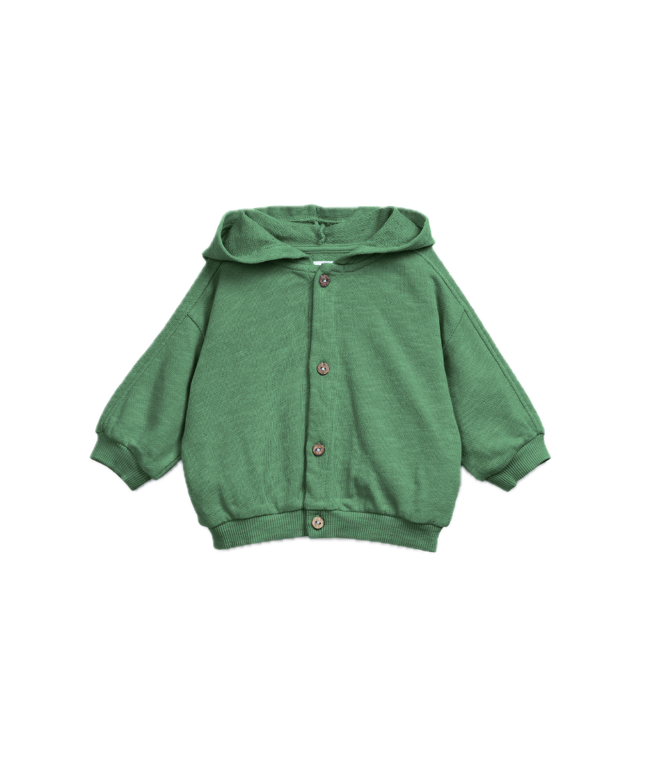 This jacket is made of knit fabric with a blend of cotton and organic cotton, in Botanical color. It features a hood, elasticated cuffs, and a front opening with coconut buttons.