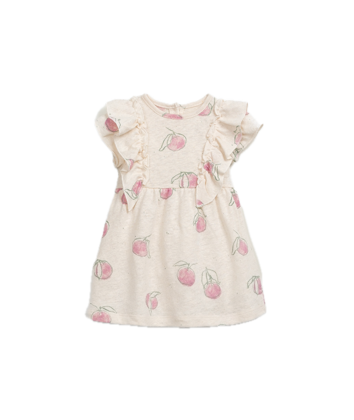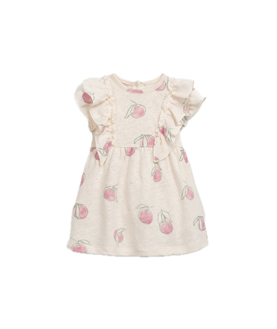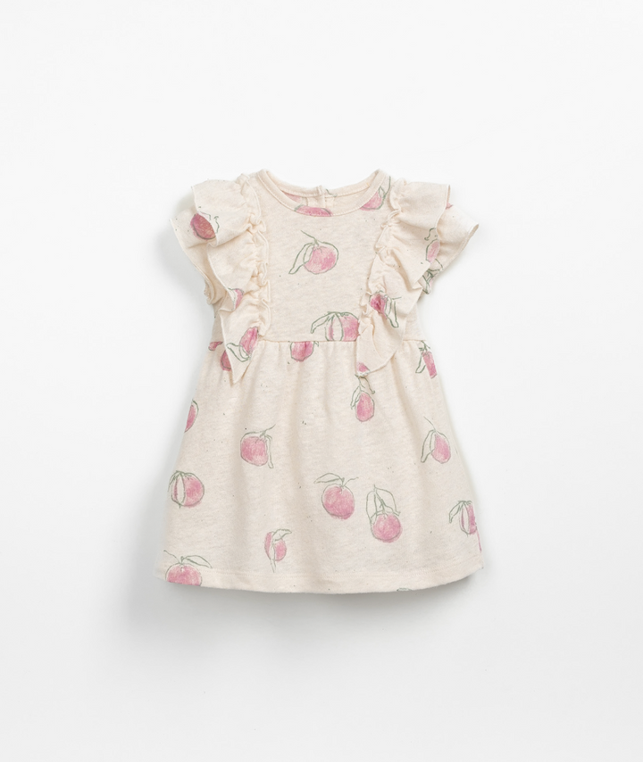 This dress is made from organic cotton and linen fabric, in Grés color. It features a fitted cut, ruffled sleeves, a fruit pattern, and a back closure with coconut buttons.