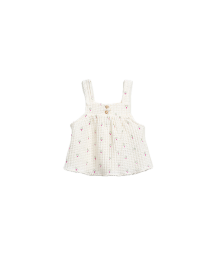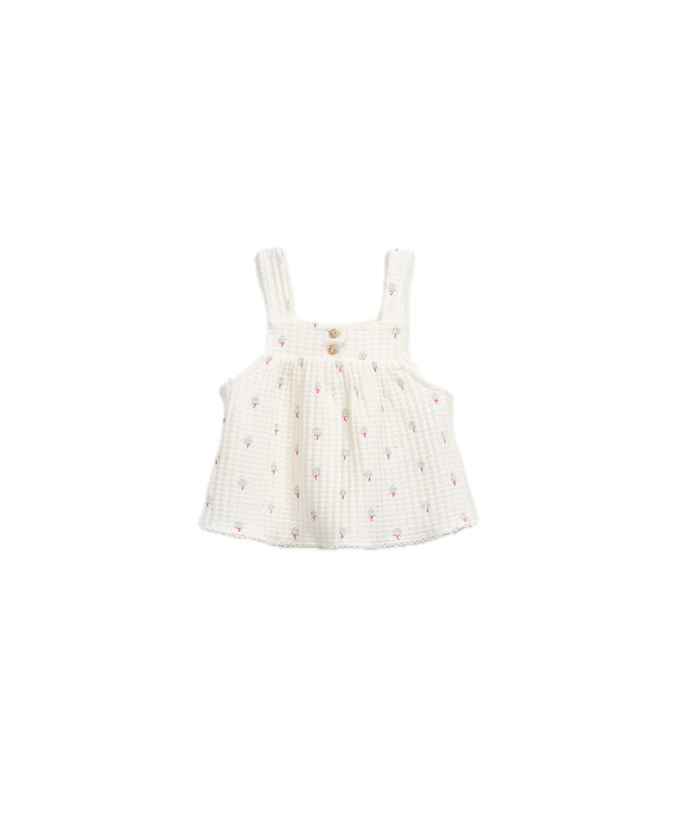 This top is made from a blend of recycled polyester, recycled cotton, and elastane, in Grés color. It is a strappy model with a loose fit, floral pattern, coconut buttons, and a wavy hem.