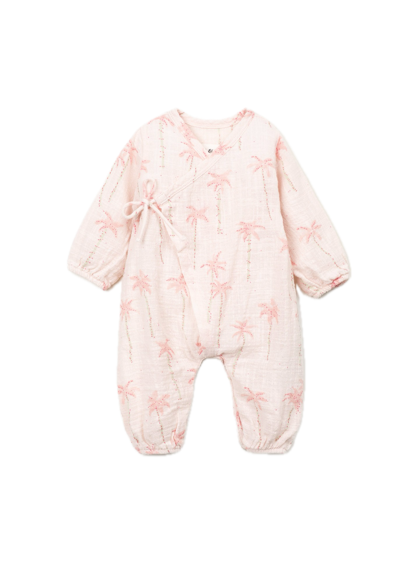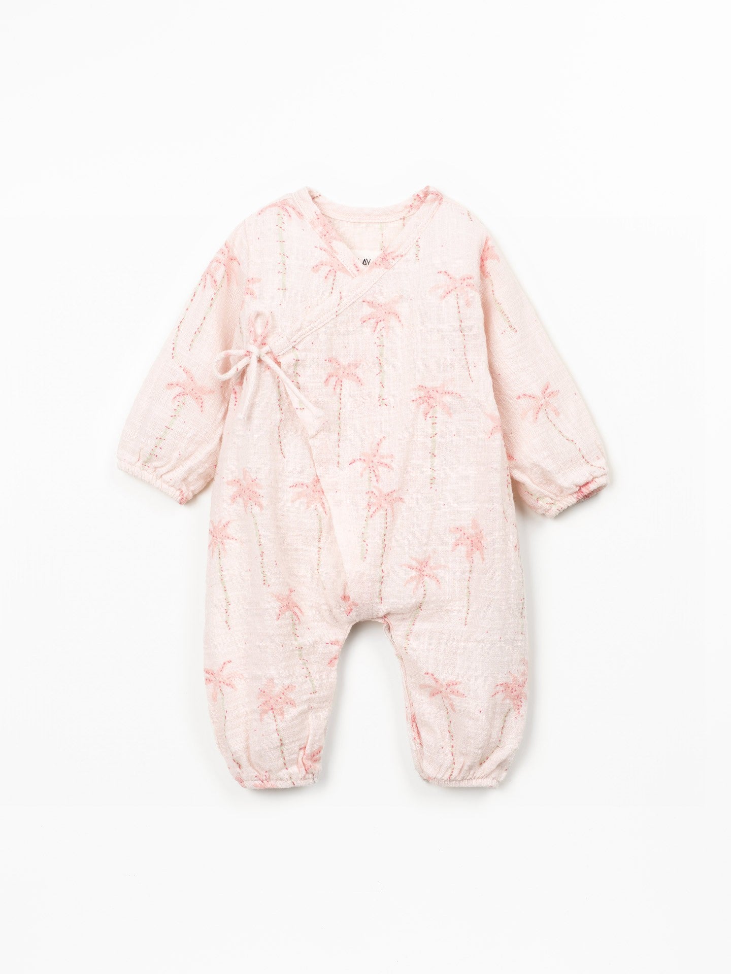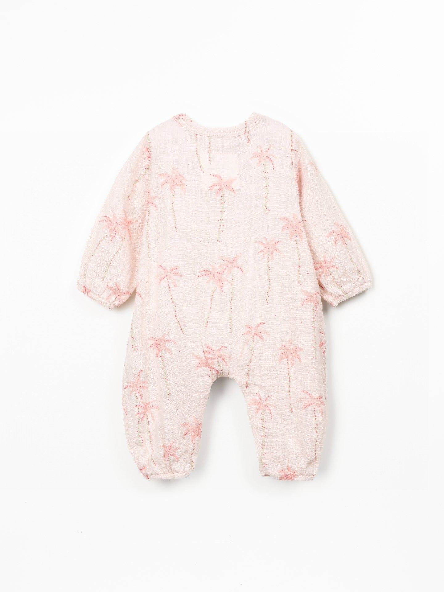 This jumpsuit is made from organic cotton jersey, in Light Pink color. It features short sleeves, round neckline and balloon shape. It has a front opening with wooden buttons and an opening between the legs with nickel-free metal snaps, and a sun print.