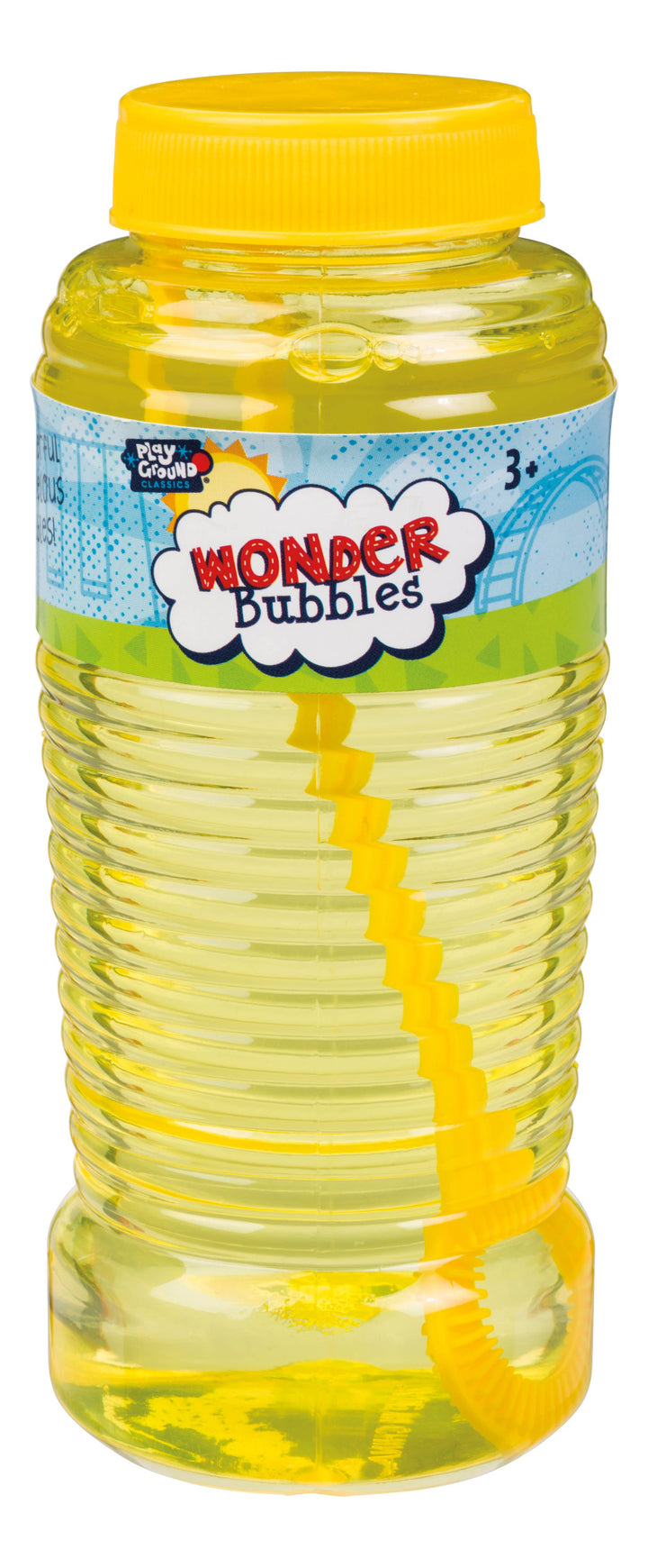 Playground Classics Wonder Bubbles is a popular bubble toy. A translucent plastic jar with a twist-off top holds 8 ounces of bubble solution and 1 double-ended blowing wand. Jars are available in 4 assorted colors. Options include orange, blue, green, and yellow containers. All the plastic wands are yellow in color and have 2 different-sized blowing holes. You get an assortment of 12 with 3 of each color option.