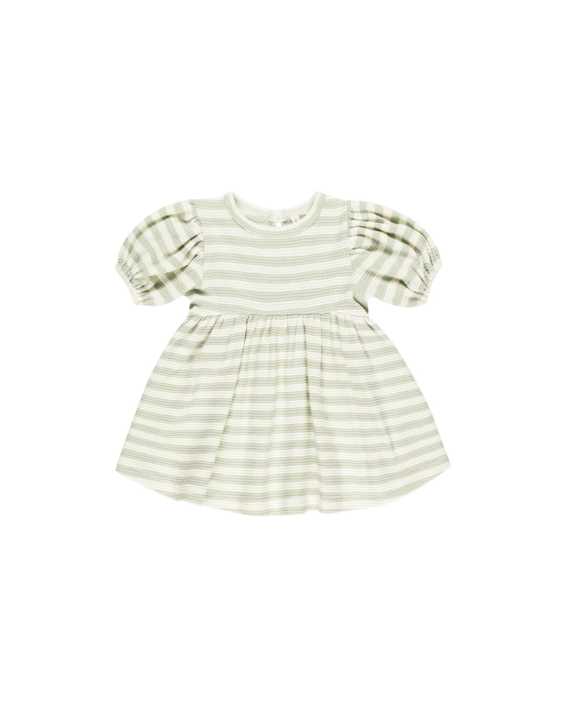 Our babydoll Darla Dress features an empire waist with balloon sleeves and a coconut button keyhole at the back neck. Coordinating bloomers included. Made from our waffle knit fabric.