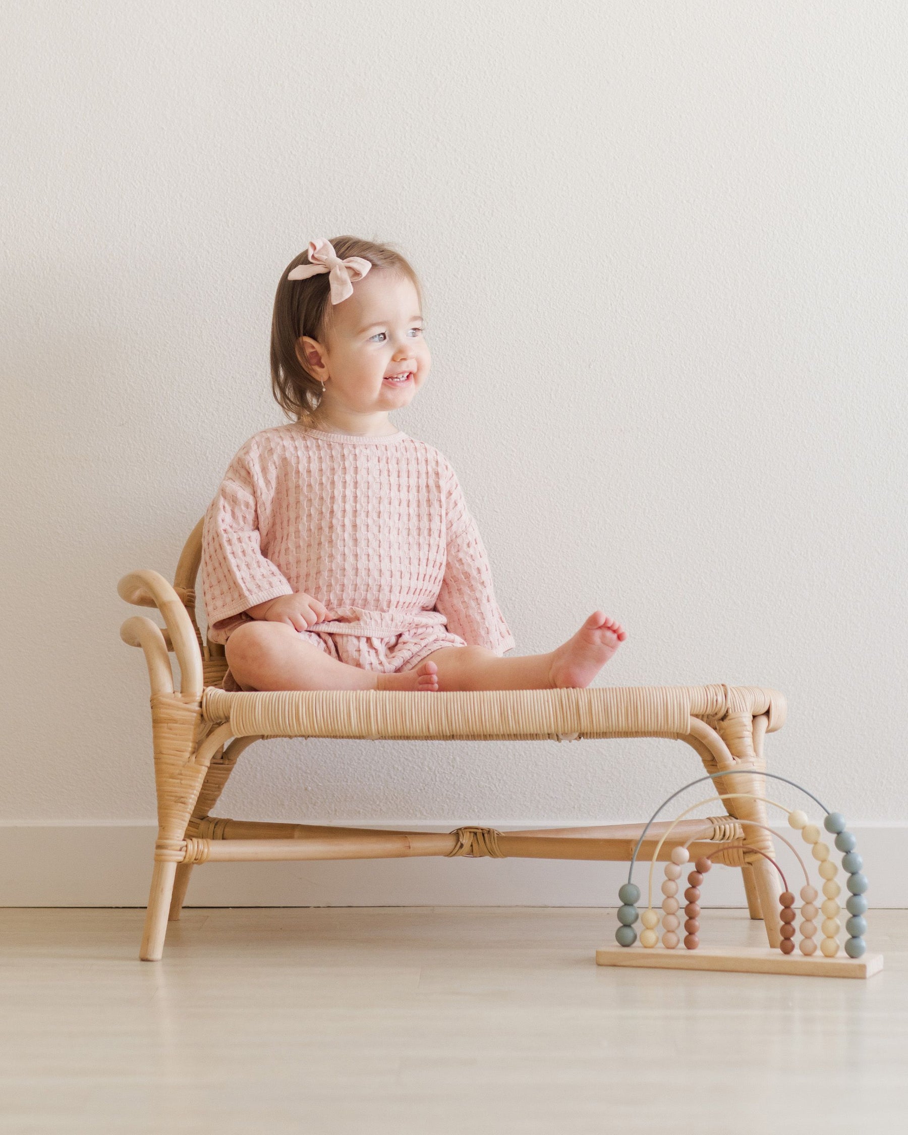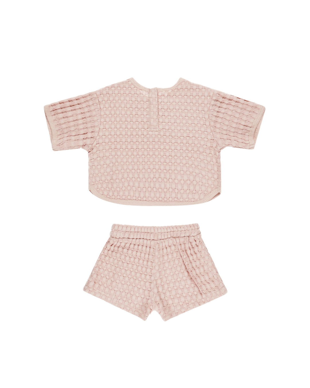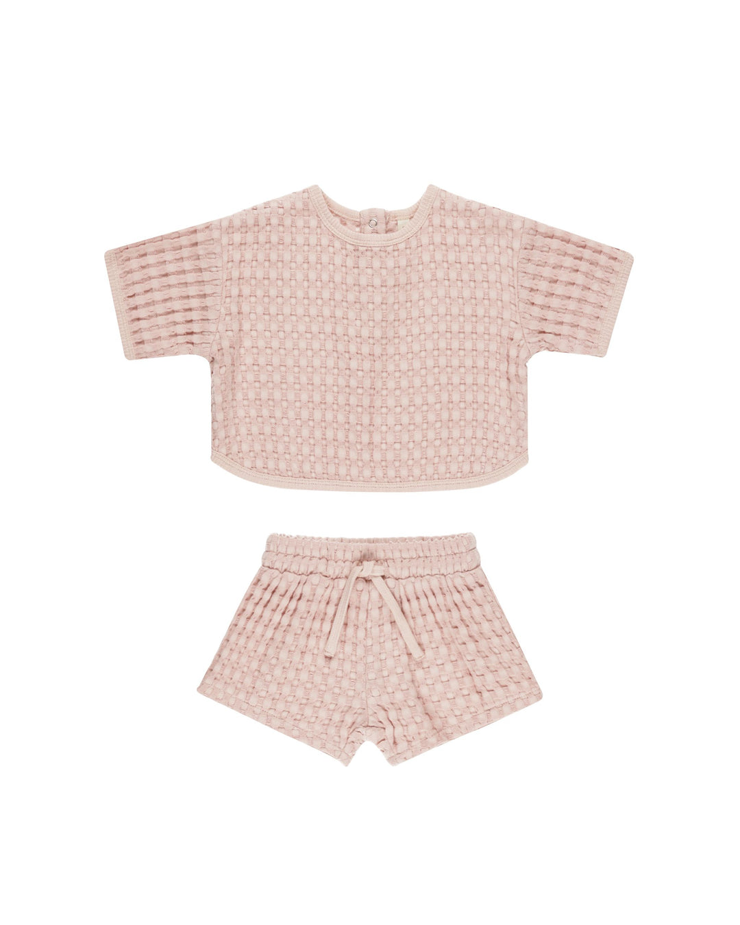 This chunky waffle short sleeve tee and short set is a cool and easy look for warm weather days. Featuring back neck snaps for easy changing.