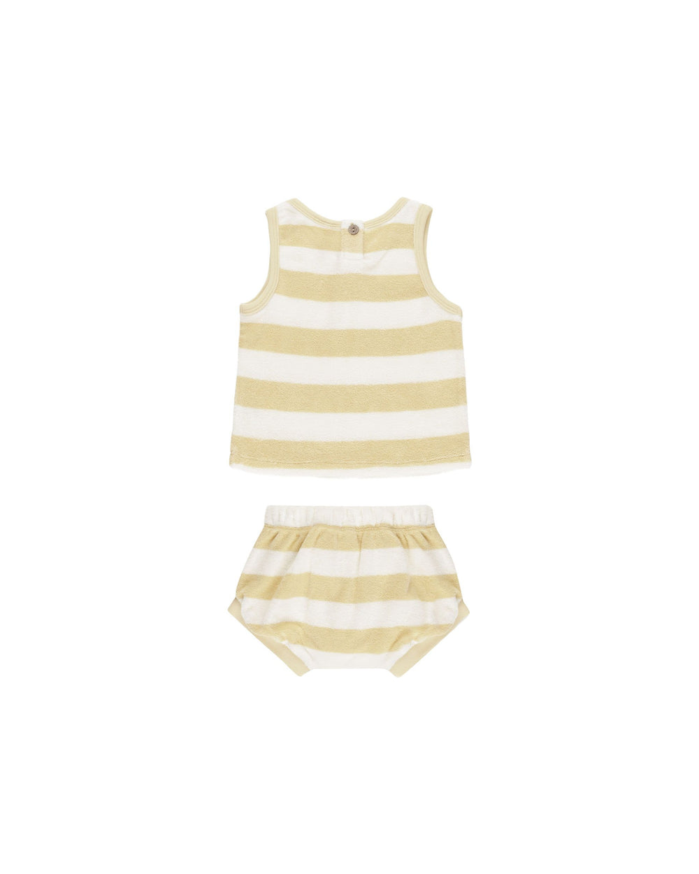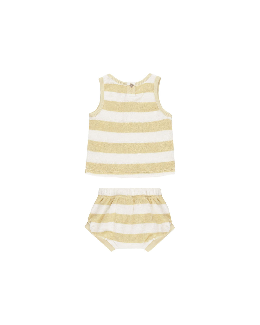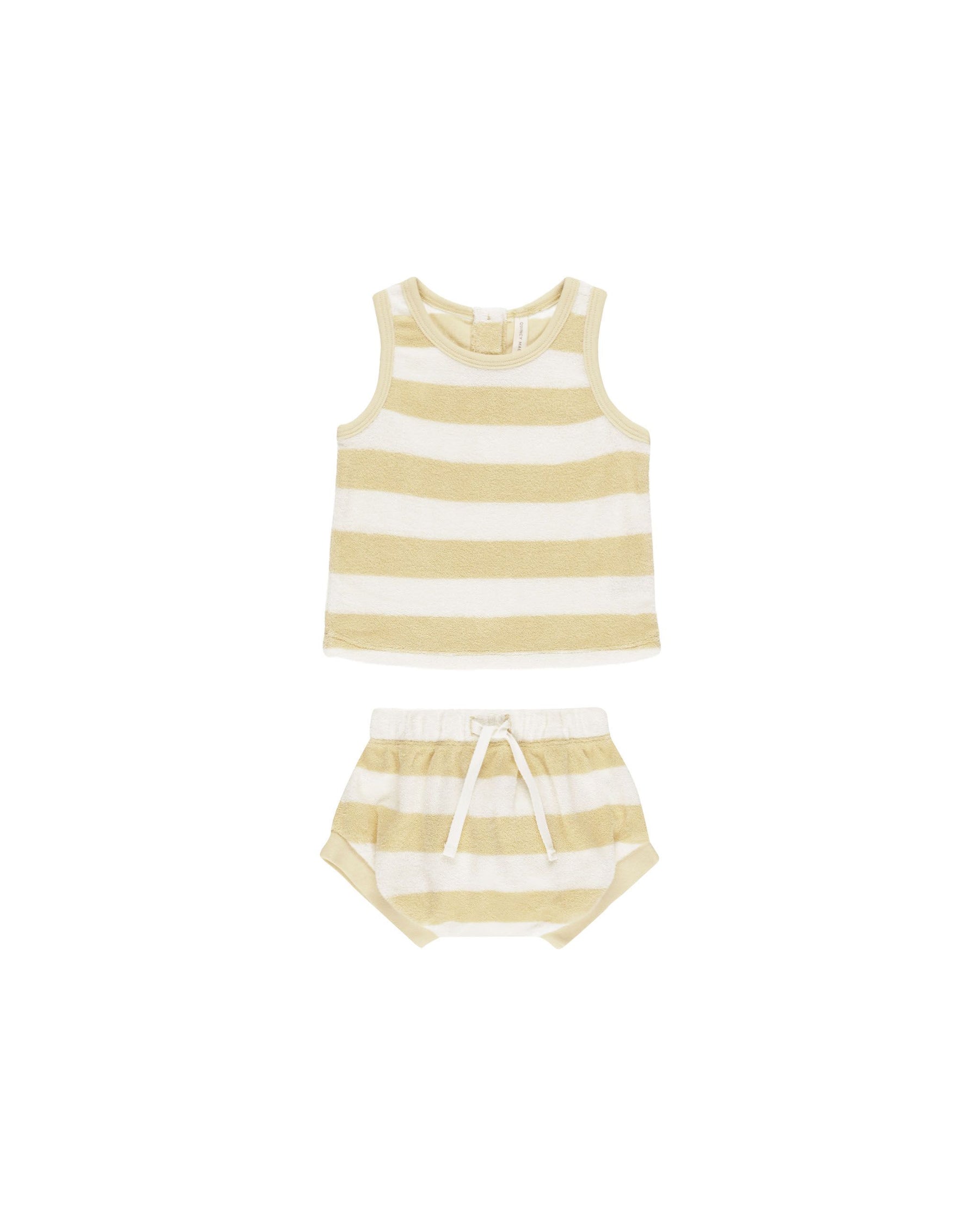 Our Terry Tank + Short Set is an easy warm-weather go-to. The tank features a snap-back closure for easy wear and the short features an elastic waist, drawstring, and ribbed leg openings for a perfect fit.