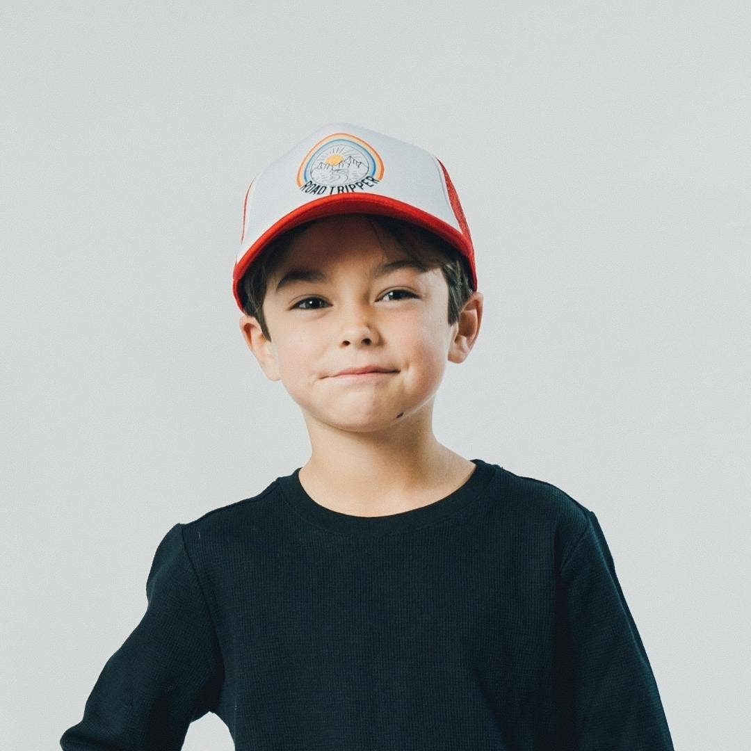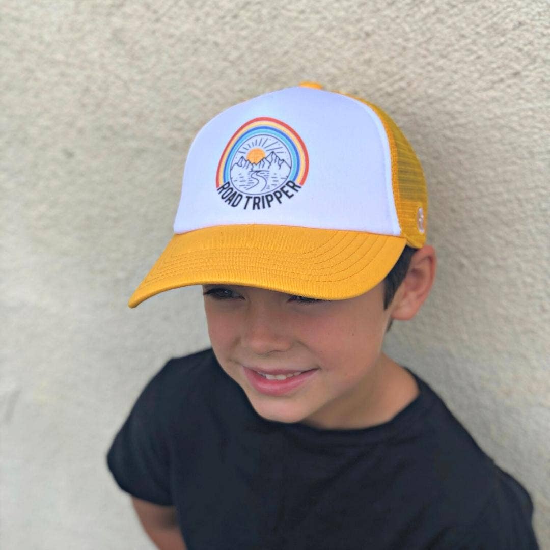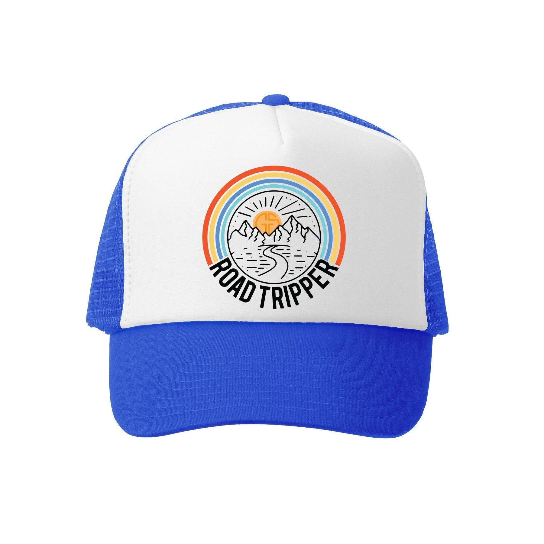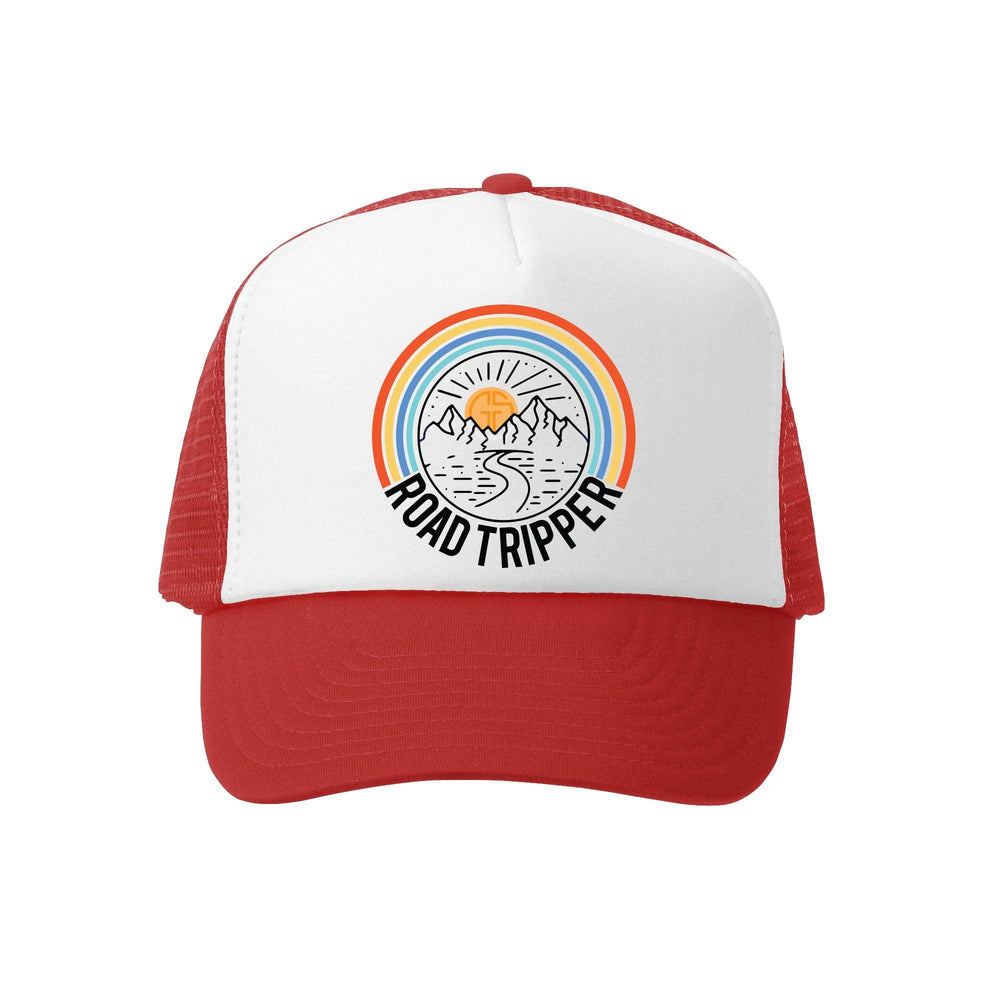 Our Road Tripper design features a winding road leading into tall, rocky mountains with a warm GS sun setting on the horizon. A retro rainbow borders the the outside of the design leading the the words at the bottom.