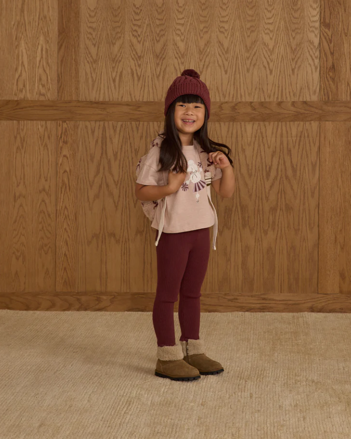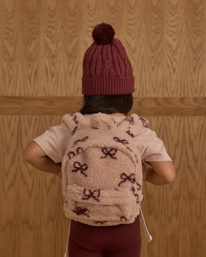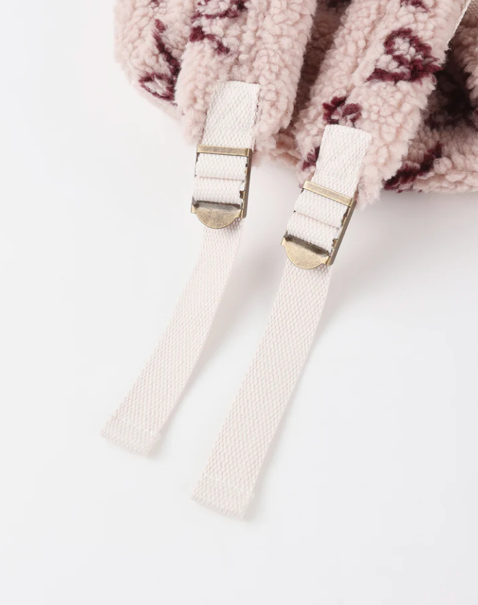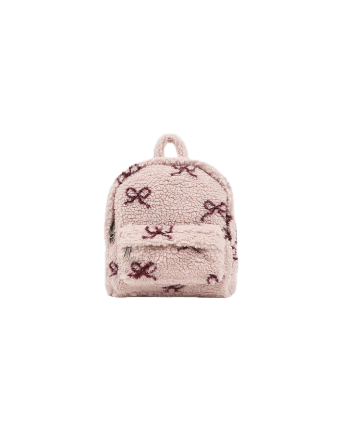 Our shearling Mini Backpack features a main zipper compartment, a front pocket, adjustable shoulder straps, and a top handle—ready to be carried any way your little one likes.