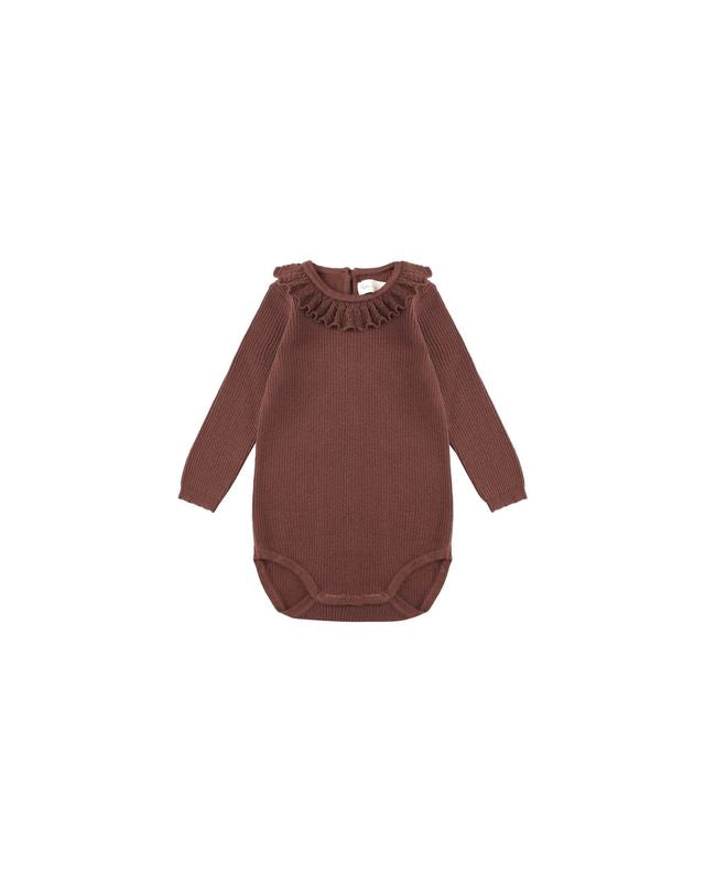 An essential for your little one, this darling knit bodysuit features a sweet ruffle collar, back keyhole button closure, and bottom snaps for effortless changes. Perfect for layering all season long.