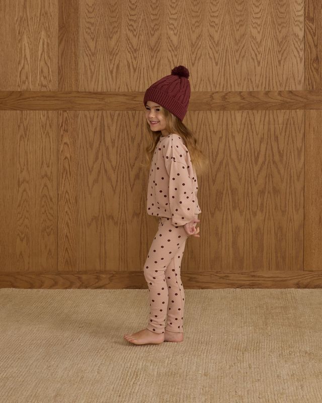Our Spongey Knit Set includes a pullover sweatshirt with balloon sleeves and an elasticized hem, paired with snug leggings featuring an elastic waistband.
