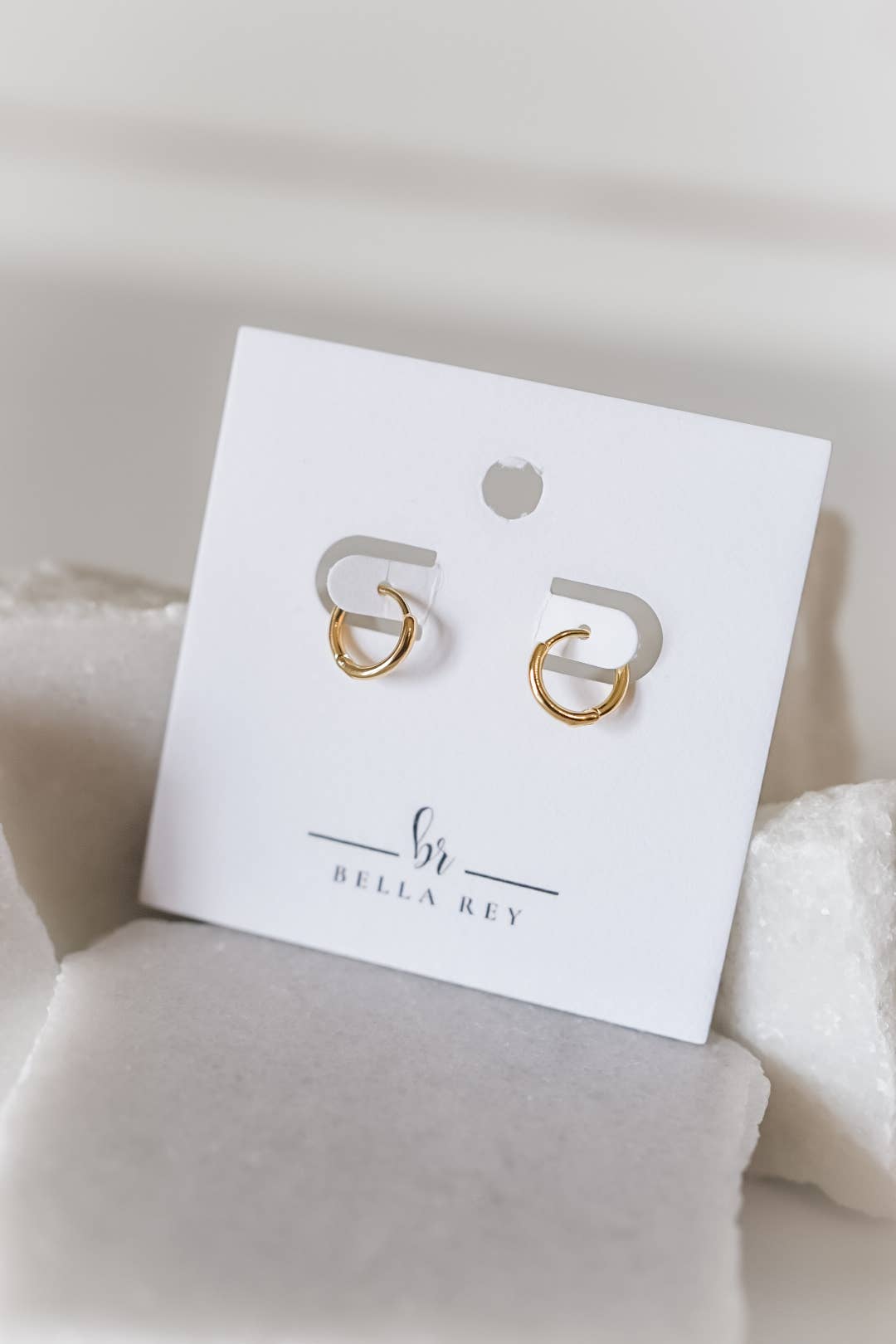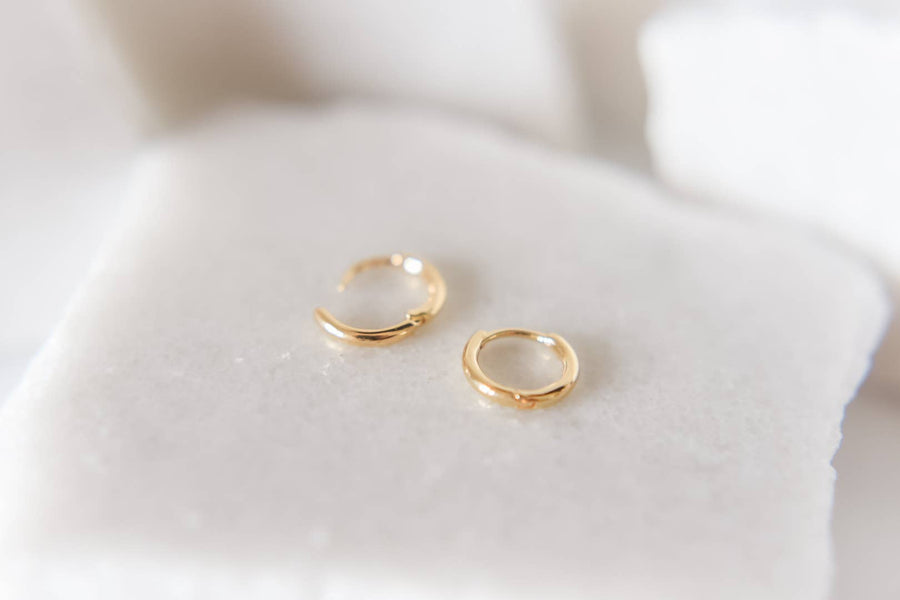 the Nia dainty gold earrings -18k gold plated hoops -clasp closure -dainty -10 mm -hypoallergenic -nickel & lead free the perfect dainty hoops for everyday.