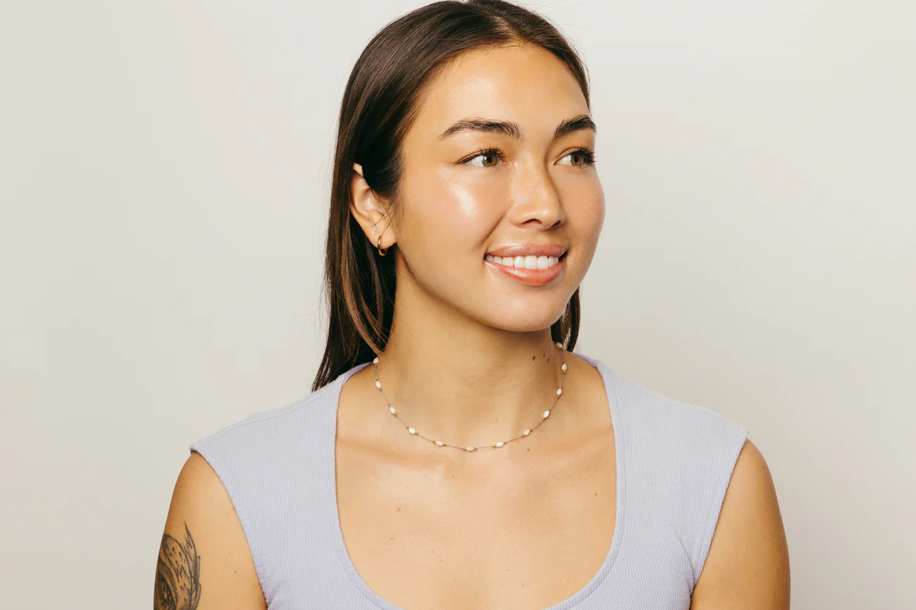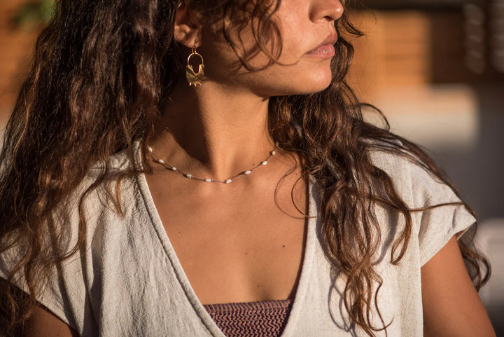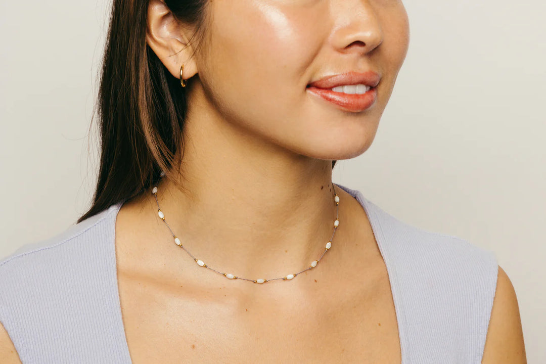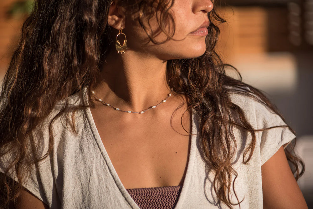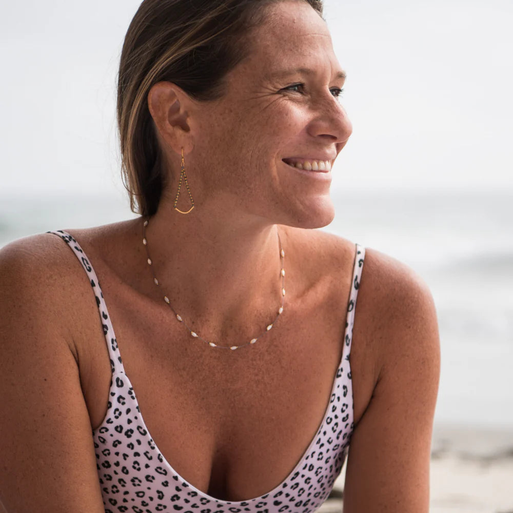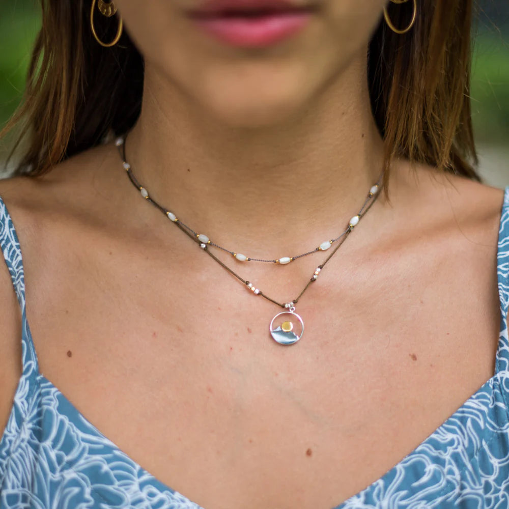 Our Tidepool necklace exudes relaxed sophistication. Natural mother of pearl beads are encompassed by gold glass accent beads on our signature nylon cording. The result is a clean and effortless piece that you can wear hiking or skiing or for a night out on the town.