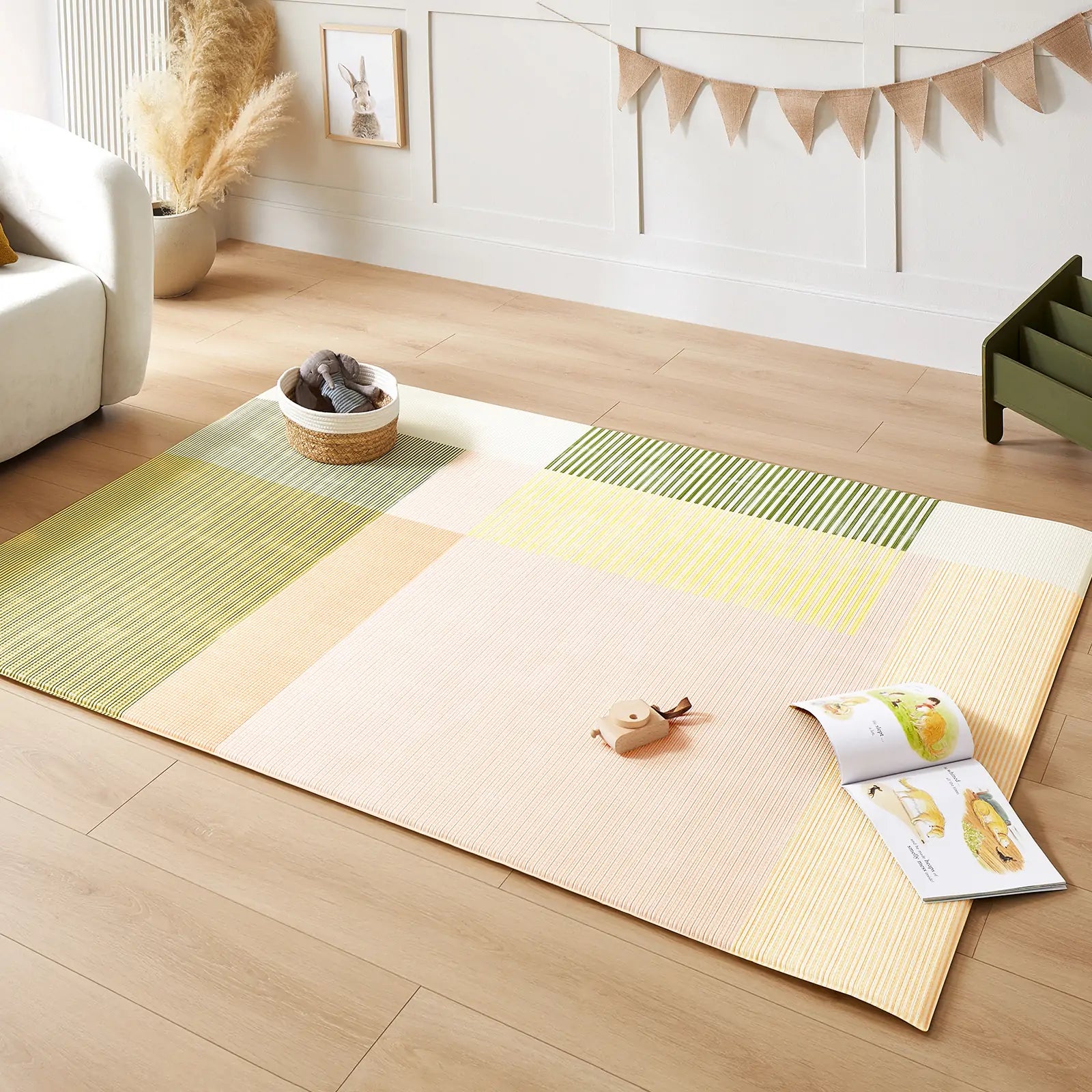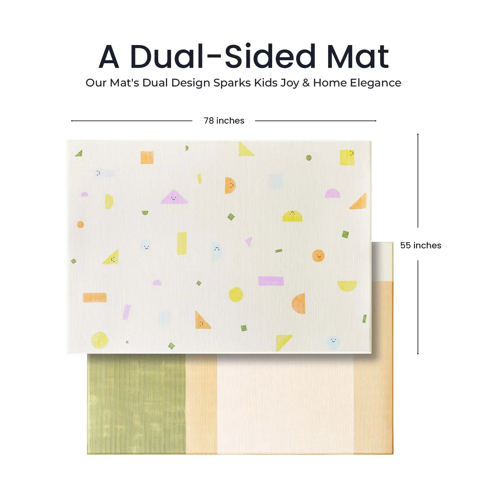 Sized at 78 x 55 inches, this playmat offers a spacious, elegant play area. Made with innovative GFOAM material, it’s soft, durable, and safe—perfect for crawling, first steps, and family fun.
