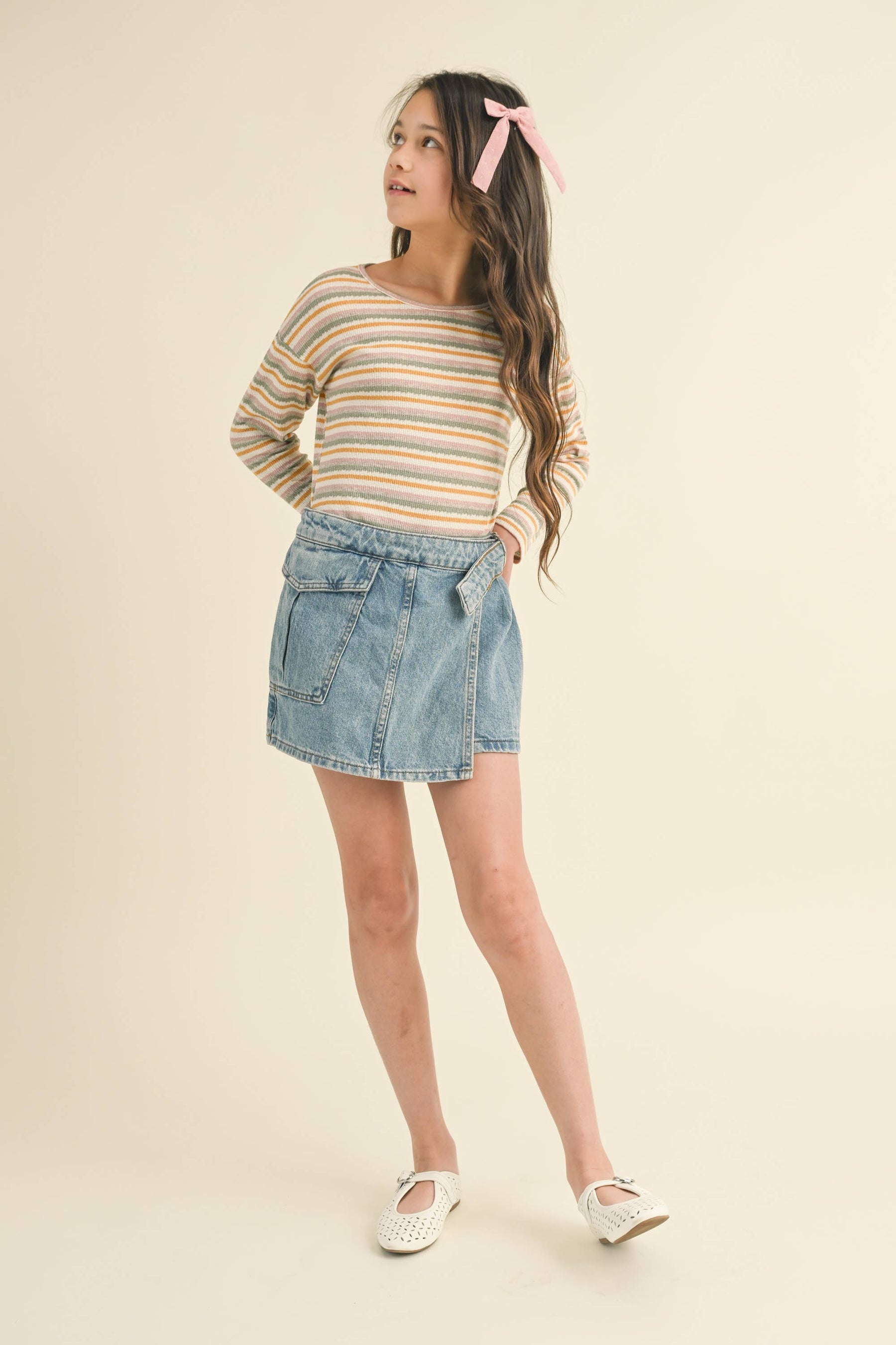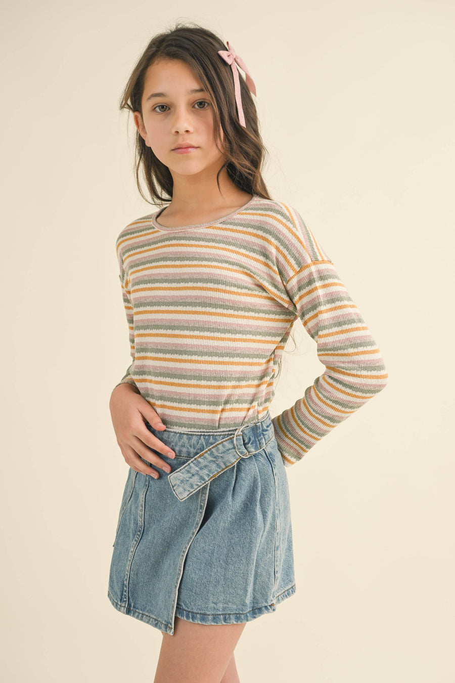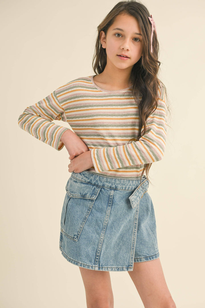A long sleeve crew neck t-shirt by Heart and Arrow, perfect for your child's fall/winter wardrobe. Crafted from a blend of 59% cotton, 33% polyester, 6% rayon, and 2% spandex, this pointelle rib top offers both durability and comfort. With its effortless style, it's an ideal addition to your little one's everyday attire.