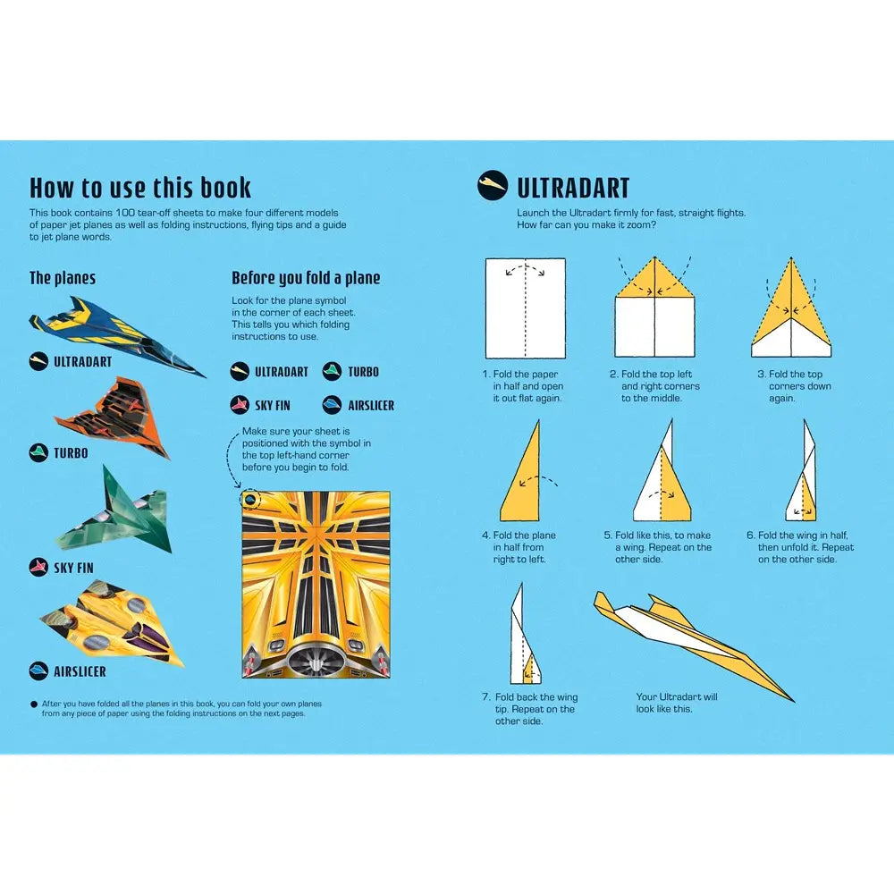 Paperback Activity Book | Usborne Spectacular designs for supersonic planes to tear out, fold and fly. Fold and fly 100 fully colored paper jet planes - each one its own unique design. This book contains 100 tear-out sheets with guidelines to help you fold, clear, step-by-step instructions for making each type of plane and lots of flying tips.