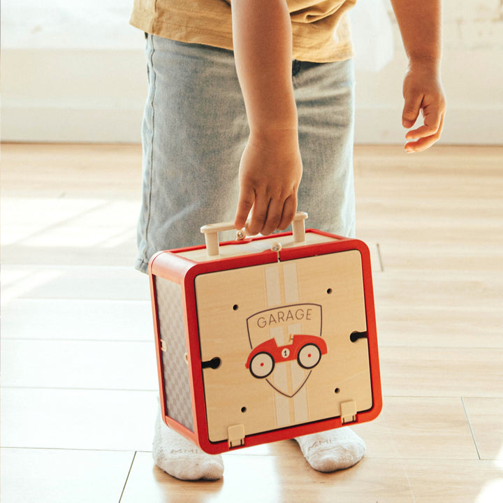 Your kiddos will love our Take with Me Garage. It comes with 12 wooden pieces including cars, trucks, peg people, ramps, signs, charging station and much more. But the best part is kids can pack up all the pieces into the carry along garage and go anywhere. Perfect for car rides, plane rides, or just quiet imaginary play at home. Fun graphics and sturdy pieces make this the perfect travel companion. Weighs just 2.3 lbs. for easy transport!
